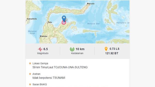 12195 BT atau tepatnya berlokasi di laut pada jarak 58 km arah Timur Laut Kabupaten Tojo Una-Una Sulawesi Tengah pada kedalaman 10 Km ujar Kepala Pusat Gempabumi dan Tsunami BMKG. KOMPASTV - Gempa magnitudo 65 mengguncang Kabupaten Tojo Una-una Sulawesi Tengah dan sekitarnya pada Senin 2672021 1909 WIB. 21 Rumah Rusak 1 Orang Meninggal.